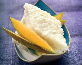 200 g de riz gluant30 cl de lait de coco2 petites mangues bien mûres1,5 cuill. à soupe de sucre en poudre1 pincée de sel