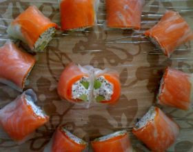 – 1 feuille de riz par rouler- fromage frais : chèvre ou nature ou ail et persil- concombre ou courgette- saumon (fumé ou cru)- graines de pavot- poivre- sel- piment d’espelette- sauce soja