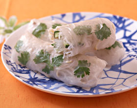 – 100 g de vermicelles de soja – 40 g de pousses de soja- 60 g de concombre- 100 g de chair de crabe égouttée – 5 feuilles de riz (20 cm de diamètre environ)- une quinzaine de feuilles de coriandre