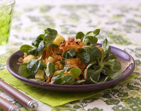 – 200 g d’ananas frais- 100 g de mâche- 200 g de carottes- 20g de pistaches- 10 g de baies de goji- 7 cl de jus d’orange frais- 3 cuillères à soupe d’huile d’olive- sel et poivre