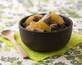– 250 g de filet de maquereau au naturel (ou de maquereau fumé)- 150 g de lentilles verte du puy- 2 oranges- 50 g de noisettes