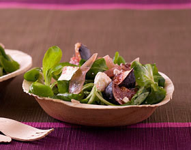 1. Lavez soigneusement la mâche et les figues.2. Ôtez la tige des figues et coupez-les en quartiers.3. Détaillez le jambon en lamelles et la feta en cubes.4. Mélangez délicatement les ingrédients.5. Au dernier moment, arrosez-les d’huile et de vinaigre et mélangez.