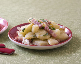 – 300 g de pommes de terre à chair ferme (Amandine, Roseval, Belle de Fontenay…)- 100 g de lardons fumés- 1 oignon nouveau- huile- vinaigre de cidre- vin blanc- sel- poivre