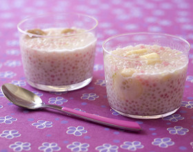 – 130 g de perles de tapioca- 40 cl de lait de coco- 50 cl d’eau- 120 g de sucre- 2 bananes- 1 goutte d’huile essentielle d’ylang ylang