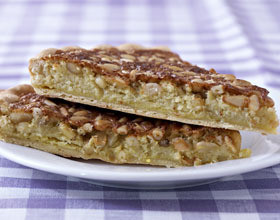 1 pâte brisée3 ufs80 g de sucre25 cl de lait20 g de maïzena100 g d’amandes125 g de pignons de pin