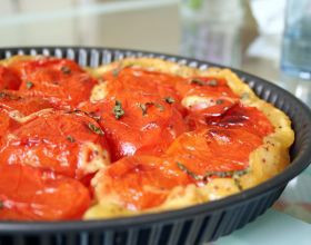 Coupez vos tomates en deux et répartissez-les dans un moule à tarte de taille moyenne, avec la peau contre le fond. Serrez bien les tomates.