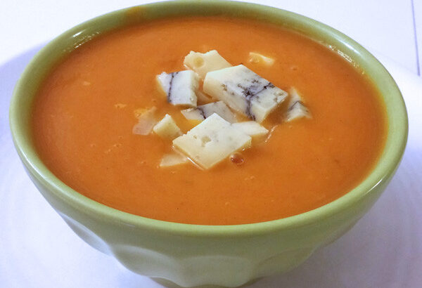Moulinez votre soupe et ajoutez des cubes de morbier une fois servie dans des bols…