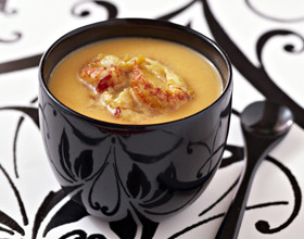 Pour mettre mes invités en appétit le soir du réveillon, je leur ai préparé un velouté de potiron au lait de coco et langoustines rôties.
