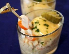 – 10 bâtonnets de surimi- 4 gros cornichons- 2 jaunes d’oeuf- 50 ml de moutarde- 300 ml d’huile- sel et poivre