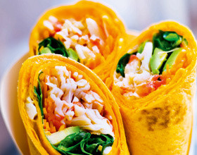 1 tortilla de blé à la tomate40 g de chair de crabe 10 g de carotte 1/4 d’avocat 1 petite poignée de mâche 20 g de mayonnaise 1/2 cuillère à café de citron confit haché
