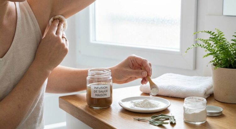 Pour vos aisselles, le rituel commence par une lotion maison. Faites bouillir 250 ml d’eau de source ou filtrée, ajoutez 2 cuillères à soupe de feuilles de sauge officinale séchées, couvrez et laissez infuser 15 minutes, puis filtrez et laissez refroidir. Appliquez chaque matin sur peau propre et sèche avec un coton, puis gardez le flacon au réfrigérateur, où il se conserve une semaine.