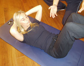 Enchaînez sans faire de pause (sauf si vos pulsations cardiaques sont trop élevées) avec des abdominaux. Allongée sur le dos, composez un angle droit avec votre buste et vos cuisses, un autre avec vos cuisses et vos mollets puis faites des relevés du haut du buste, de la tête et des épaules. Faites attention à maintenir un écart entre votre thorax et votre menton de la dimension d’une balle de tennis afin de ne pas mettre trop de tensions sur vos cervicales. Faites 20 relevés au début puis 50 au bout d’une semaine d’entraînement.