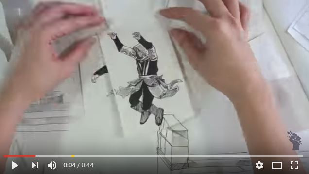 En dessinant sur une suite de papiers intelligemment collés entre eux, cachés puis dépliés, on obtient cette vidéo épatante ! Une sorte de stop motion qu’on aiderait de ses mains.